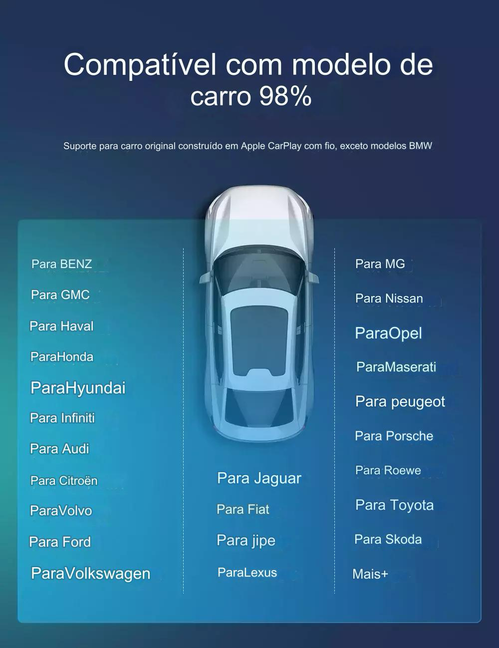 - Para Mercedes-Benz (2016 a 2023), Nissan Qashqai, e todas as séries BMW, o CarPlay não é suportado sem modificações ou instalação de um decodificador CarPlay.